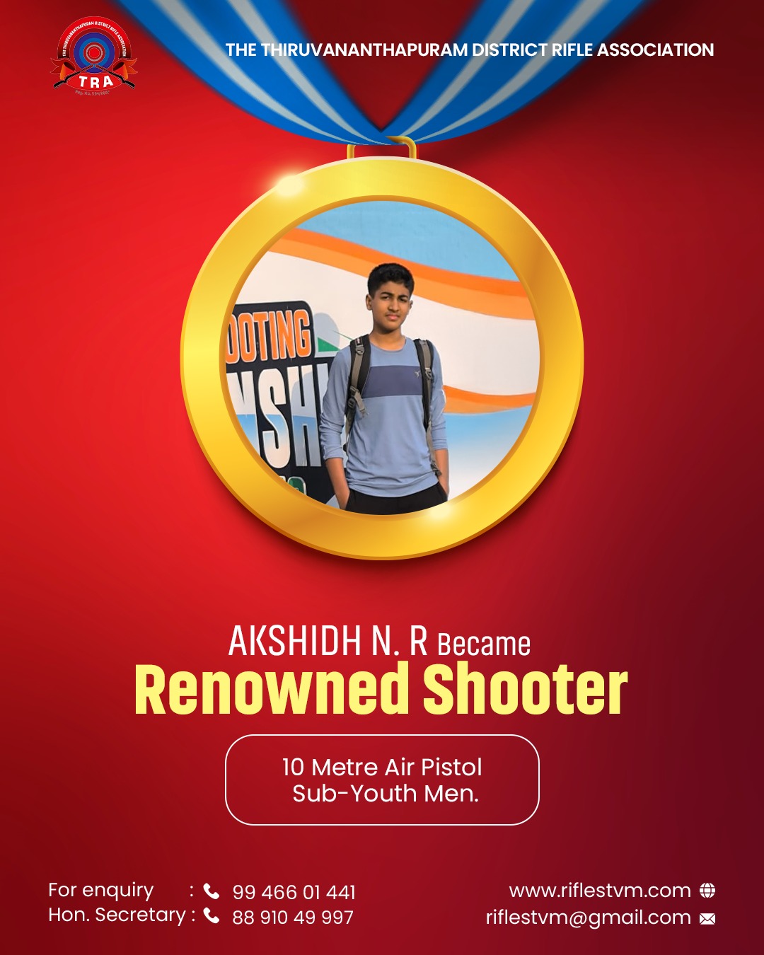 AKSHIDH N. R. Became renowned in 10 Metre Air Pistol sub-youth men.