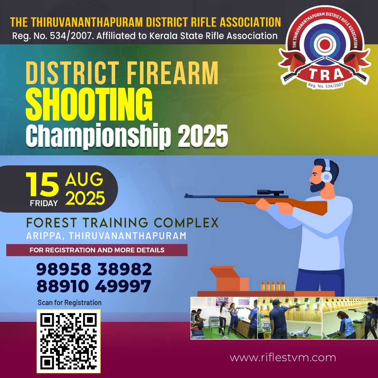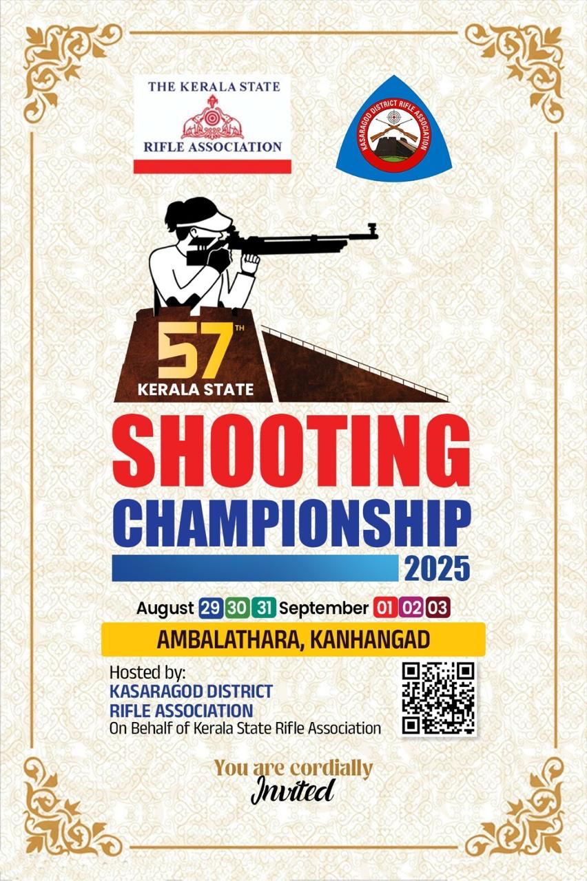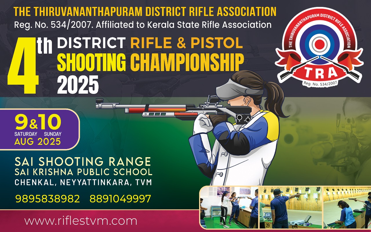 The Thiruvananthapuram District Rifle Association 4th District Rifle and Pistol Championship 2025 9th Saturday and 10th Sunday August 2025 Venue Sai Shooting Range, Sai Krishna Public School Chenkal, Neyyattinkara, Thiruvananthapuram 695132 Last Date for Entries: Entries must be submitted by 8:00 PM on 7th Aug 2025 . Late entries will not be accepted under any circumstances.