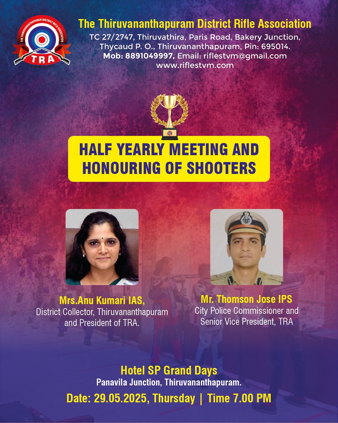 Half year meeting and honouring national trials eligible and renowned shooters. Welcome speech:Mr.Manoj T. Secretary, TRA. Presidential address:Mr.George Sebastian, Vice President, TRA. Inauguration:Mrs.Anu Kumari IAS, District Collector, Thiruvananthapuram and President of TRA. Lightning the lamp. Address and memento presentation:Mr. Thomson Jose IPS City Police Commissioner and Senior Vice President, TRA Felicitation: Mr. Biju Prabhakar IAS Dr. K. K. Manojan Dr. Devin Prabhakar Vote of thanks:Mr. Vinod V. S Treasurer, TRA.