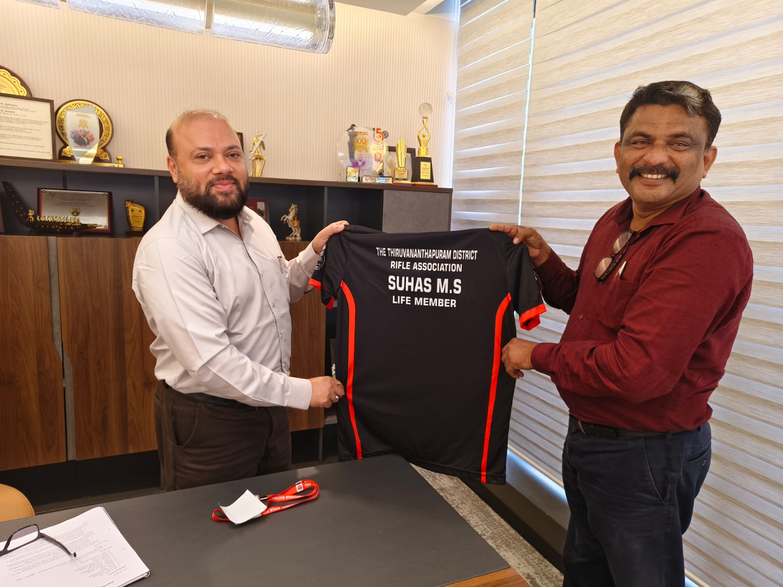 TRA Secretary Mr. Manoj handing over the official TRA T-shirt to M.S. Suhas, TRA member.